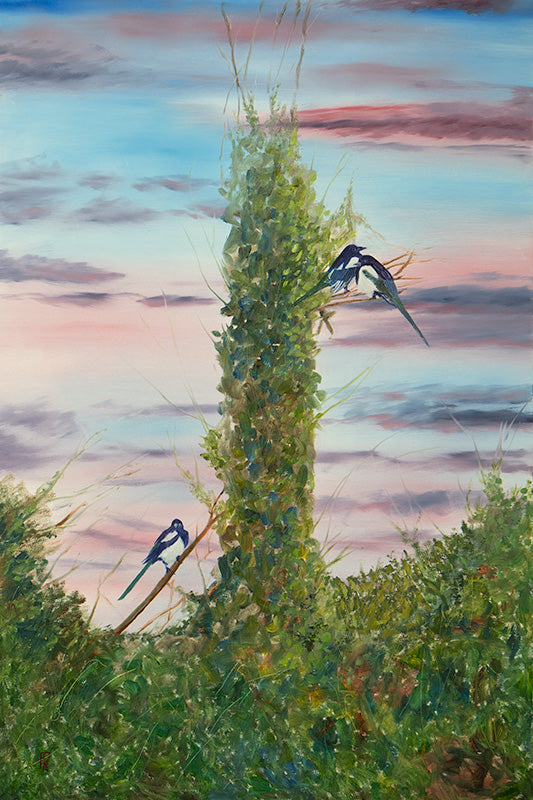 The third in the Magpie Series. A bird painting depicting the family with a predominent pinky sunset and abstracted foliage.