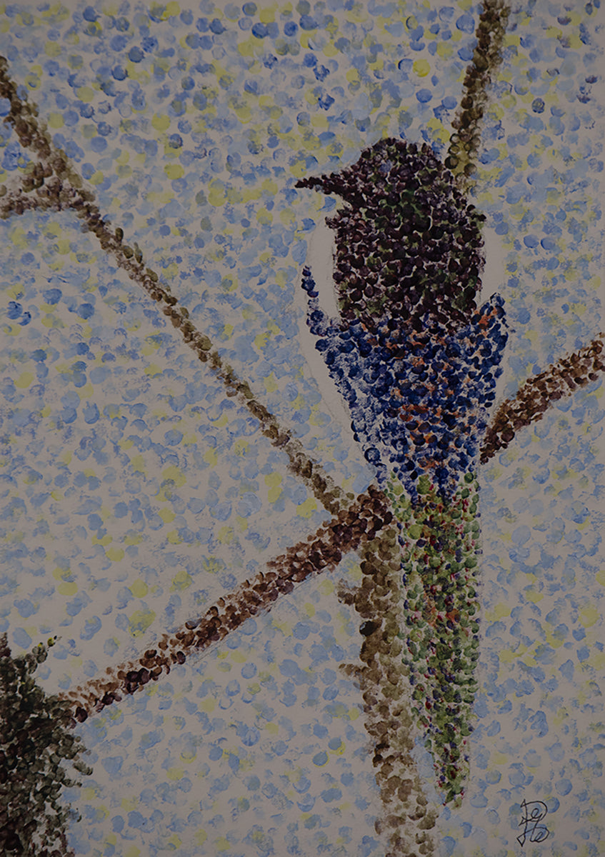 The first in the Magpie Series: This painting was created in the pointalism style. It depicts a single magpie yet to find a mate. Despite the title the colours are cheerful and uplifting as I like to think all my paintings bring joy to my collectors environment.