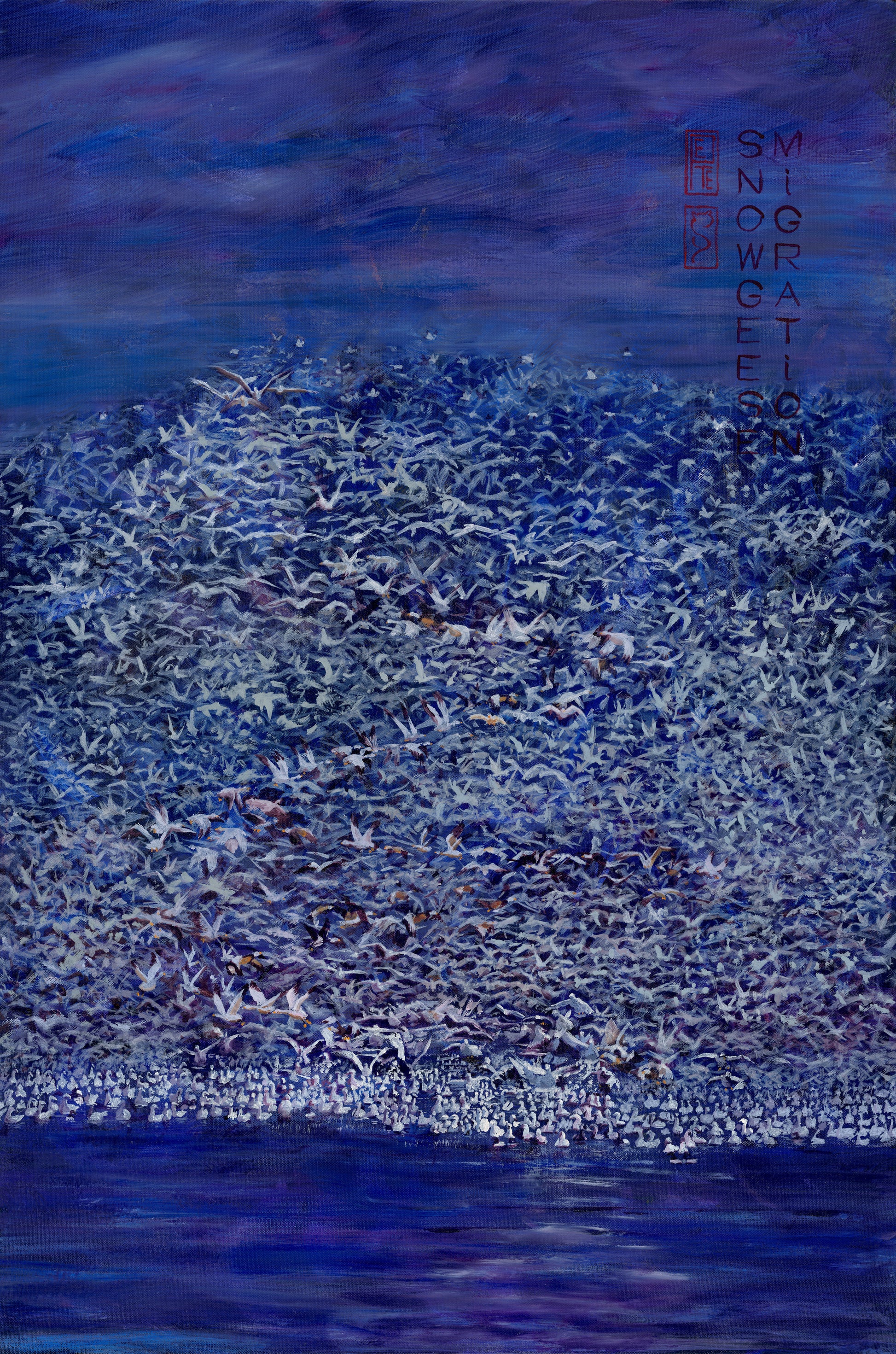 Snow Geese - Migration: A spectacle captured on canvas. Painted in Oil in a semi abstract fashion. The painting depicts geese that gather by the thousand, and when its time to go on migration or fly to roost or feeding grounds they set off en-masse. The noise from such a gathering is breathtaking and moving.