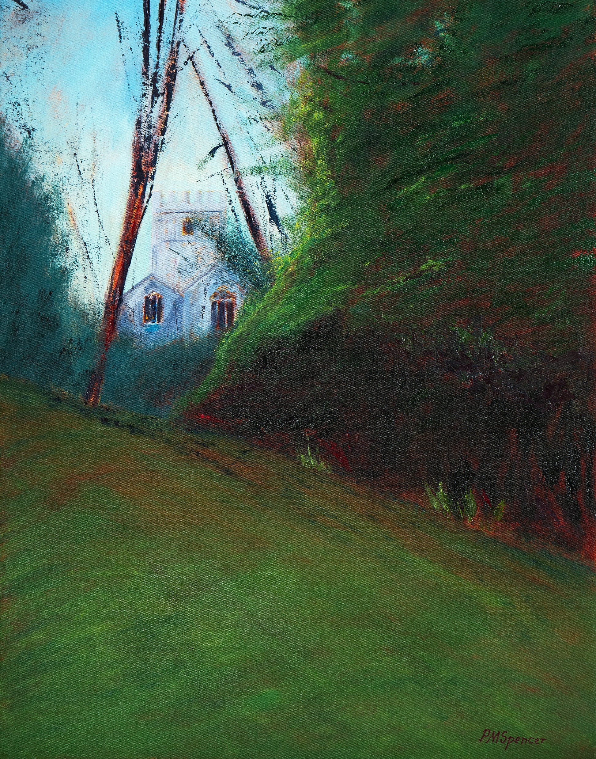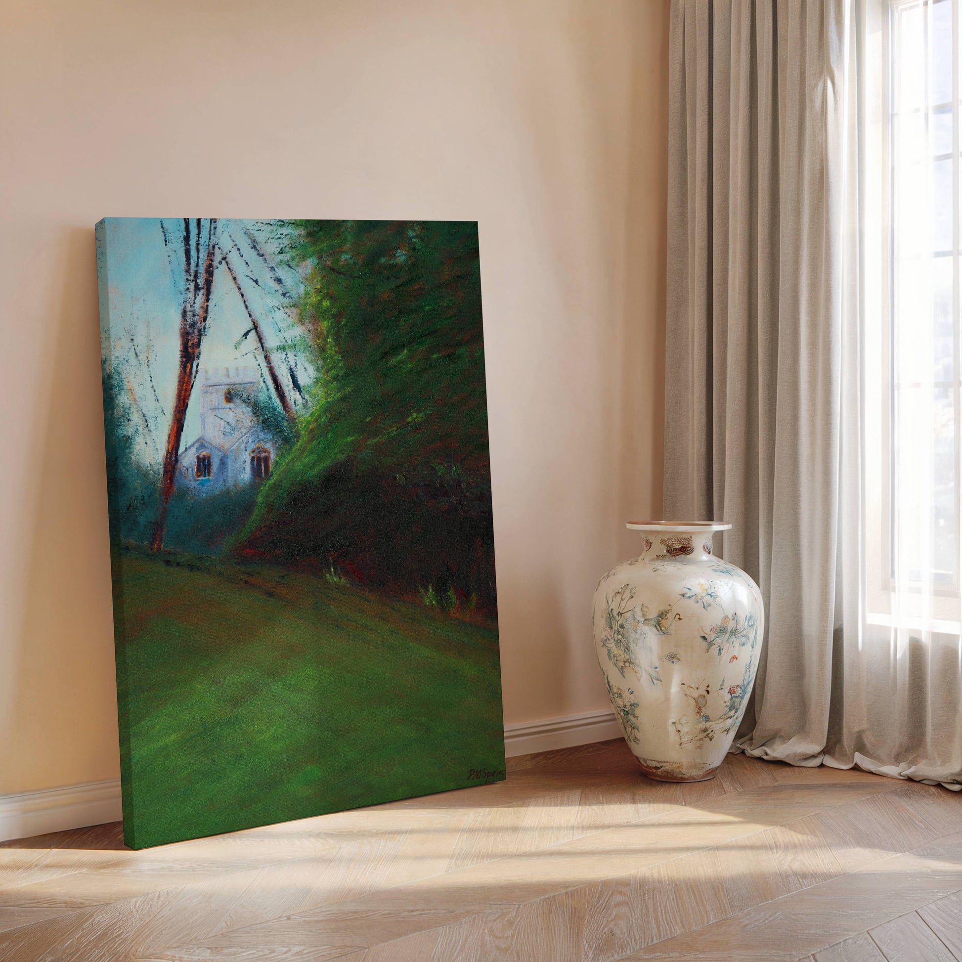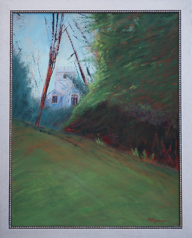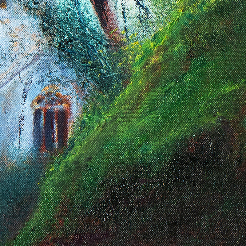 An oil colour painting on a bespoke canvas panel within a silver frame.